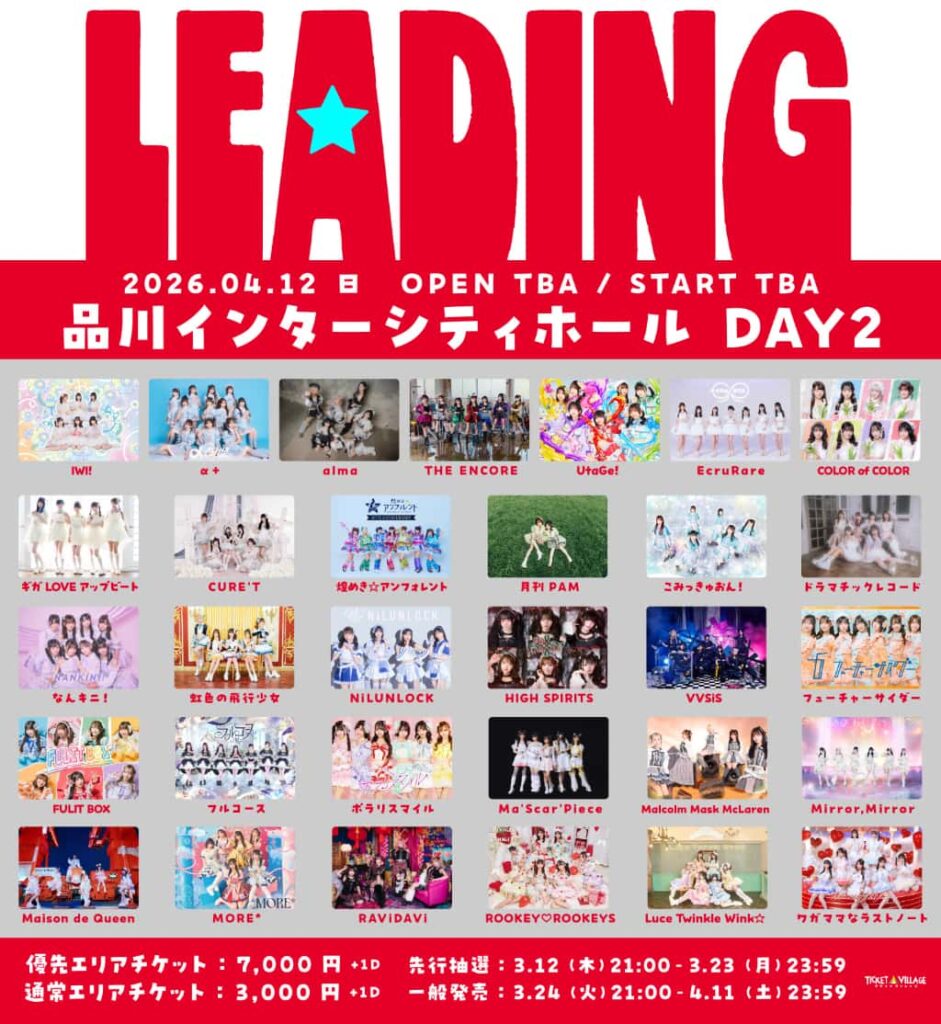 LIVE 概要 タイトル 『LEADING DAY2』 開催日 2026年4月12日 場所 品川インターシティホール 出演 IWI! / α+ / alma / THE ENCORE / UtaGe! / EcruRare / COLOR of COLOR / ギガLOVEアップビート / CURE'T / 煌めき☆アンフォレント / 月刊PAM / こみっき... -