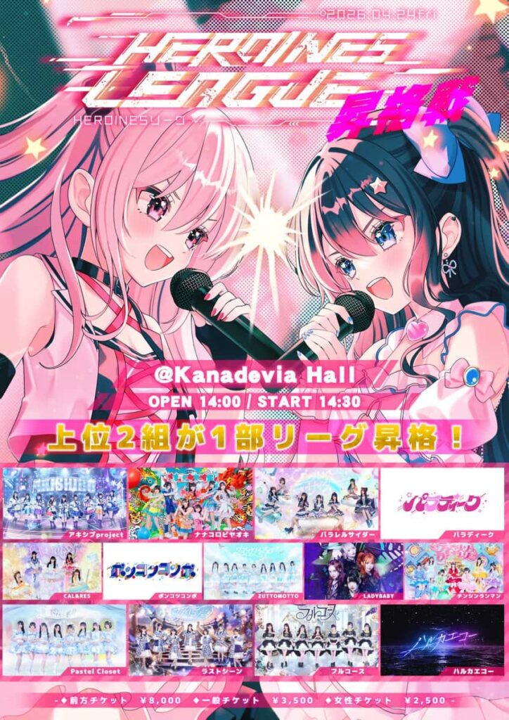 LIVE 概要 タイトル 『HEROINES LEAGUE 昇格戦』 開催日 2026年4月24日 場所 Kanadevia Hall 出演 アキシブproject/ナナコロビヤオキ/パラレルサイダー/パラディーク/CAL&RES/ポンコツコンポ/ZUTTOMOTTO/LADYBABY/テンシンランマン/ラストシーン/フル... -